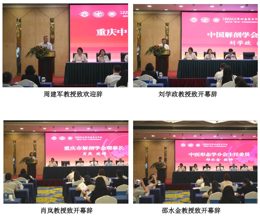大会开幕式由重庆中医药学院基础医学院副院长、人体解剖学与组织胚胎学教研室主任刘茜教授主持。重庆中医药学院党委书记周建军教授在致辞时向来自全国各地的专家教授和参会代表等莅临重庆参会表示真诚的感谢和热烈的欢迎,并详细介绍了重庆中医药学院的发展历程、建设成效及未来发展。中国解剖学会党委书记刘学政教授对与会代表的到来表示热烈欢迎,对中医形态学分会和重庆中医药学院基础医学院对本次会议的周到安排表示感谢,并对会议的成功召开表示诚挚的祝贺。中医形态学会主任委员邵水金教授、重庆市解剖学会理事长肖岚教授分别致辞,并预祝本次大会圆满成功。